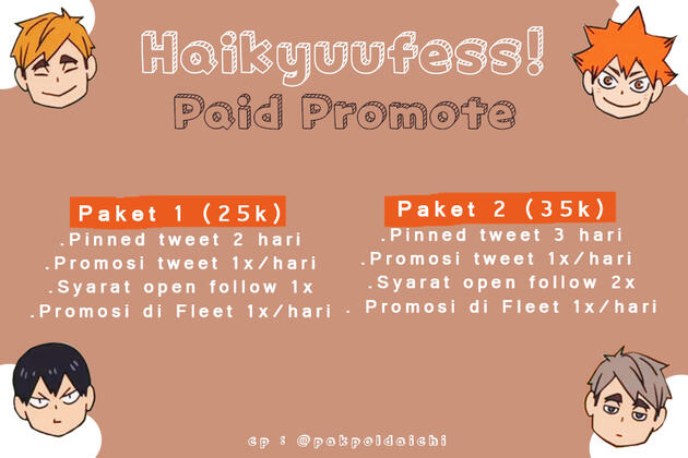 Paid promote bisa berhubungan dengan Haikyuu maupun tidak. Kami berhak untuk menolak ajuan paid promote bila perlu.